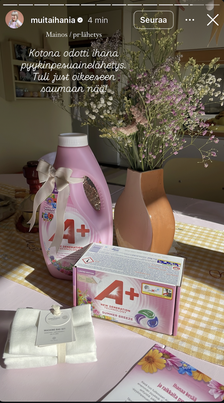 Vaikuttajille lähetettiin näyttäviä, kesäisiä PR-lähetyksiä, joiden keskiössä loistivat A+:n limited edition Summer Breeze -pesuaineet. Paketit suunniteltiin tukemaan kesän tuotteiden omaa visuaalisuutta ja henkeä.